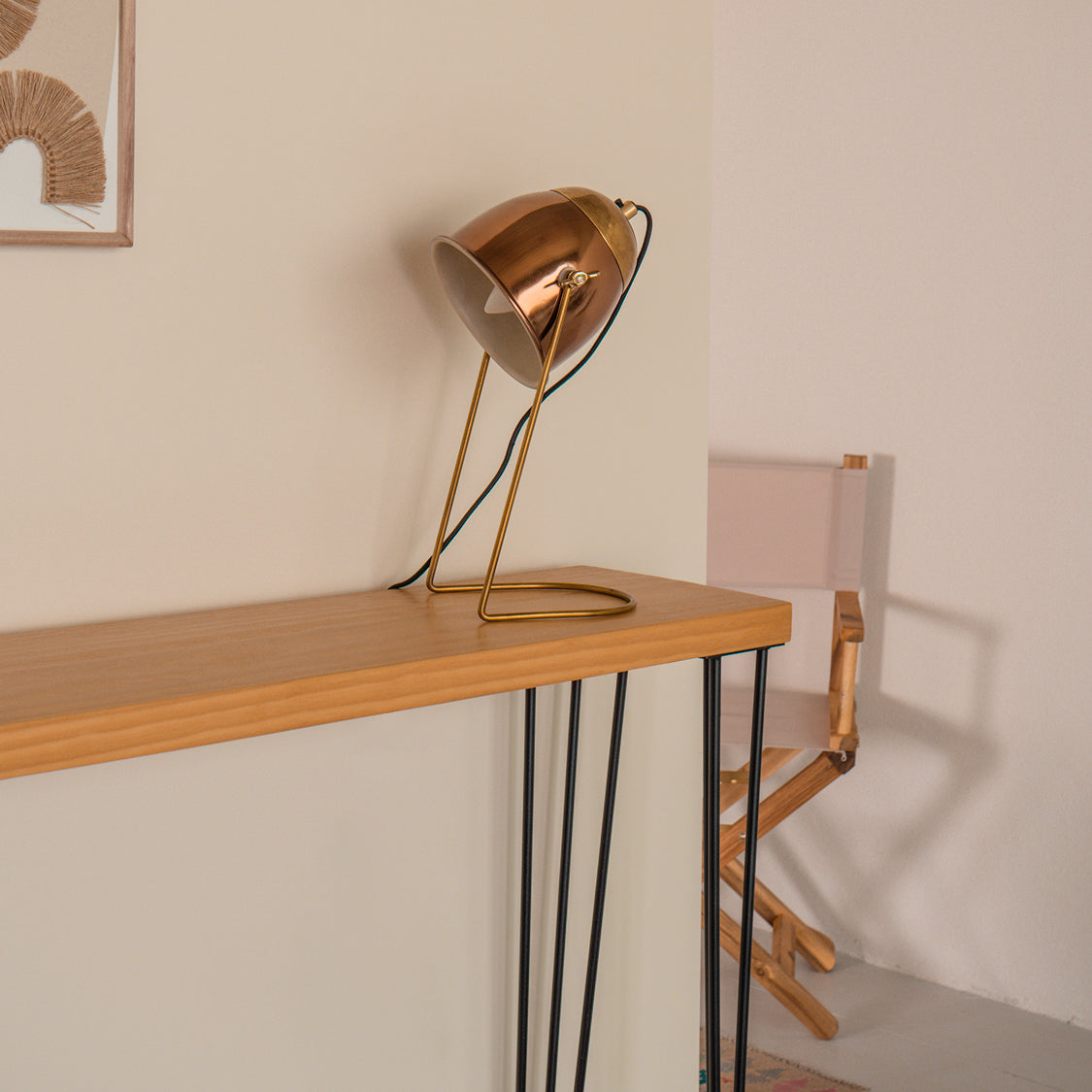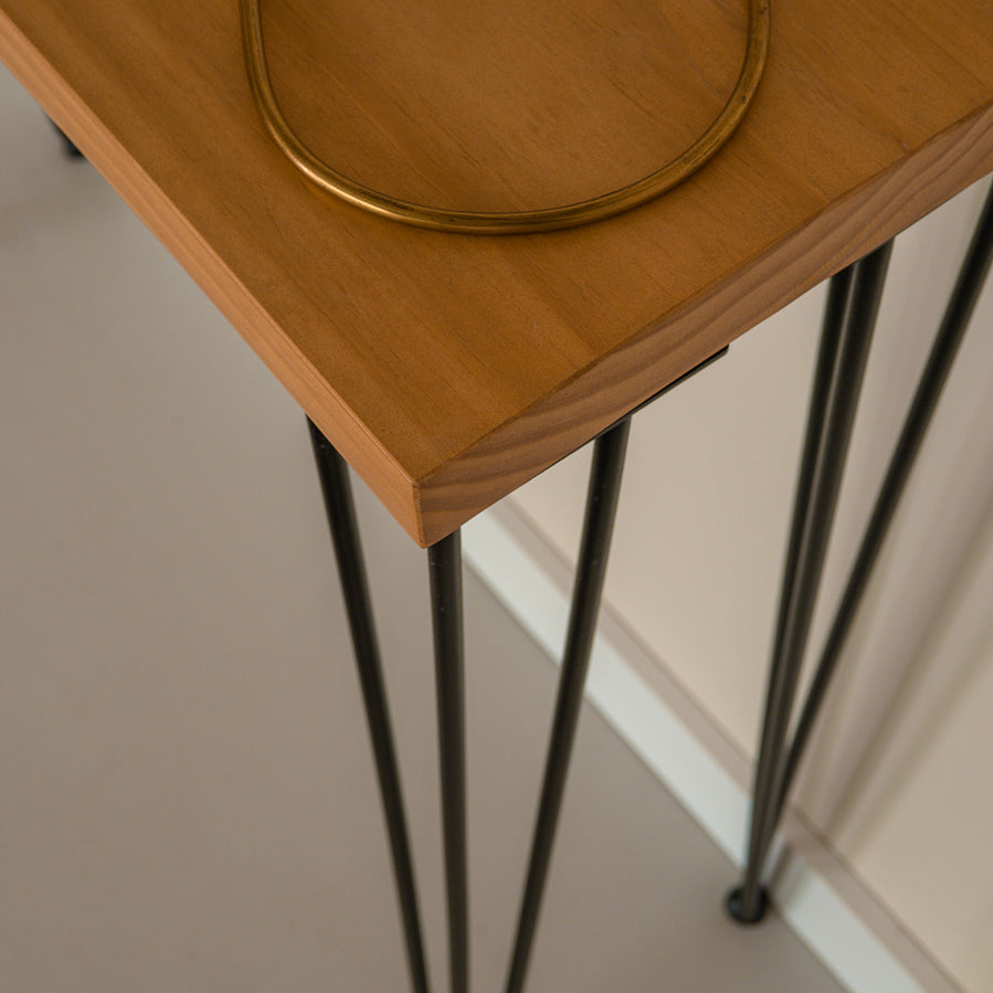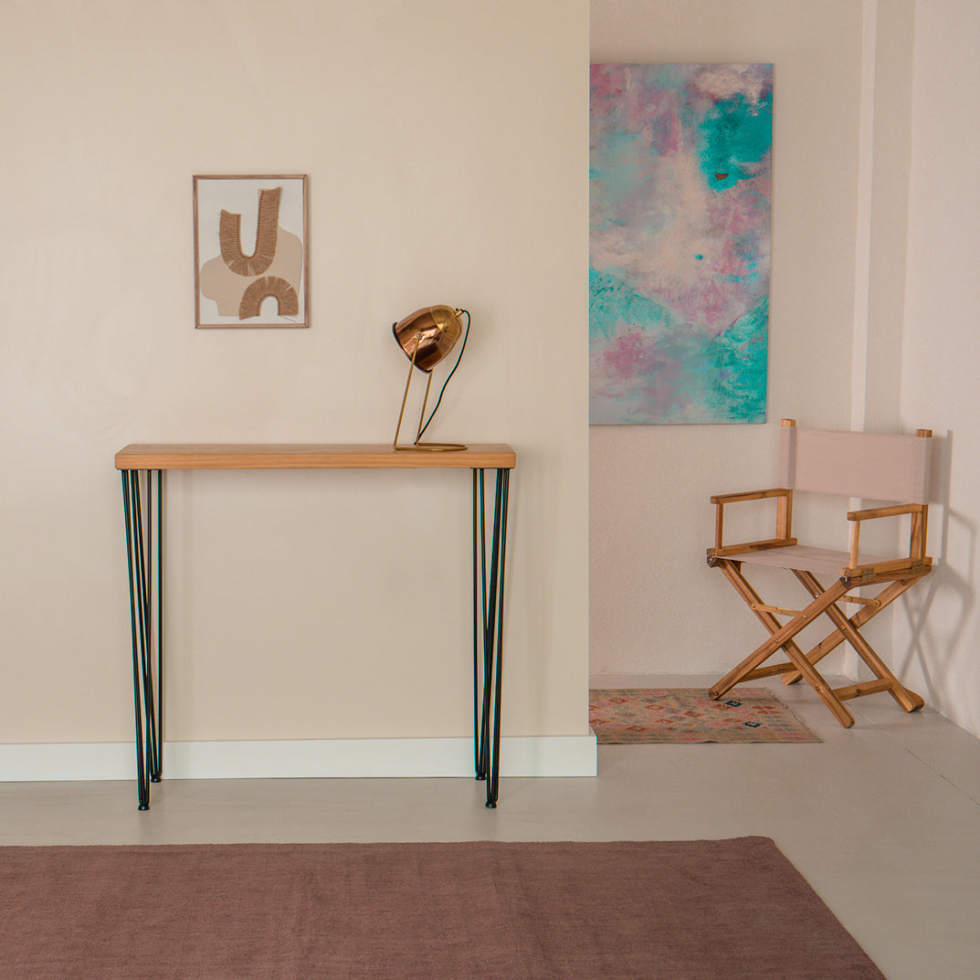 Sobre de madera maciza de al menos 4cm de grosor y patas de horquilla de 86cm de altura.
