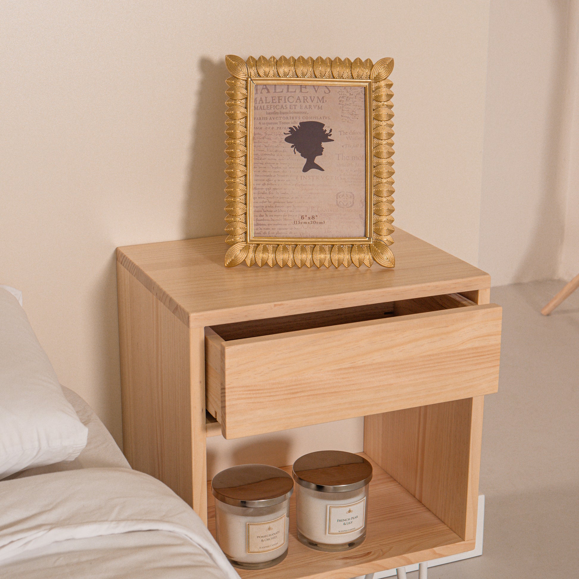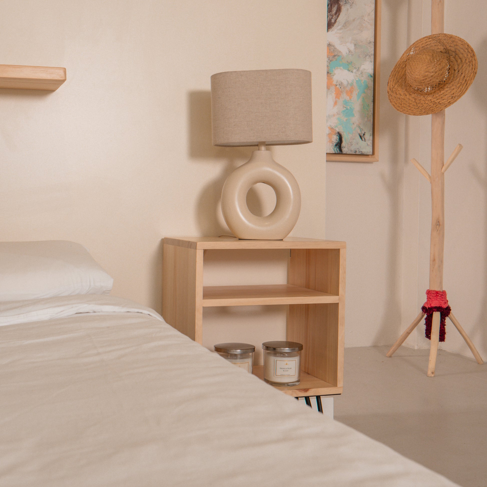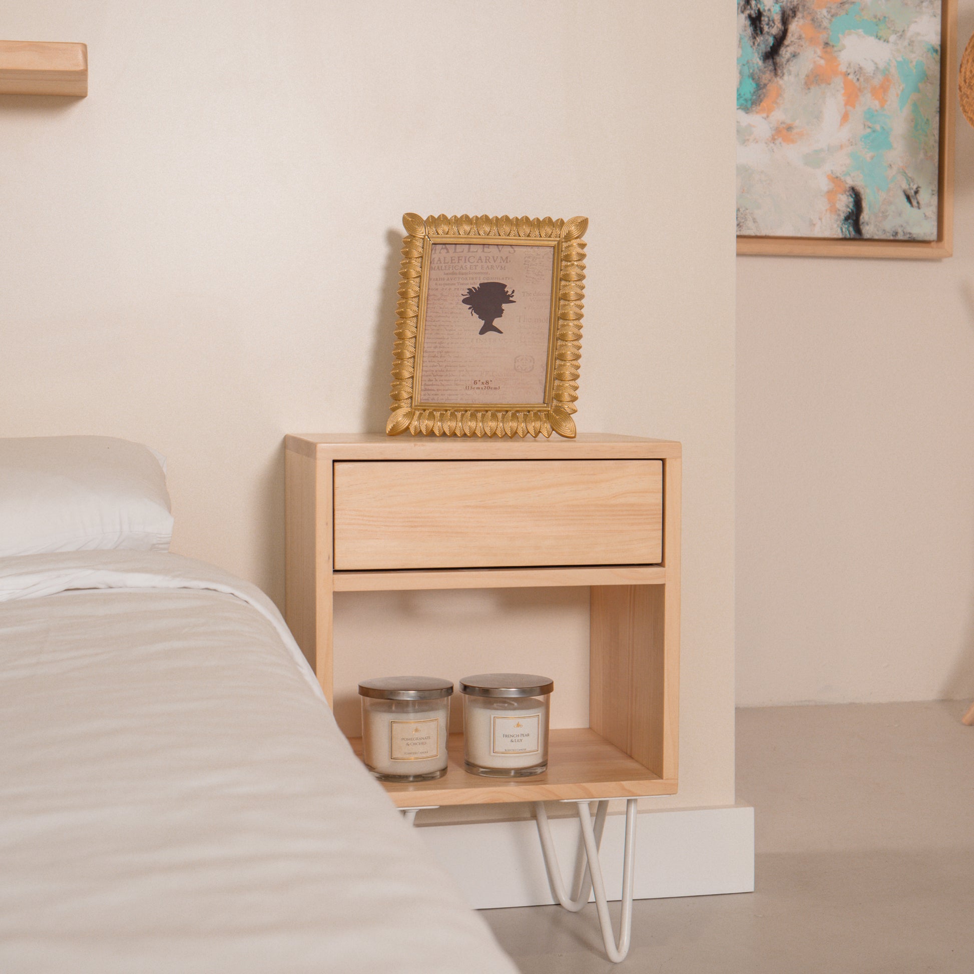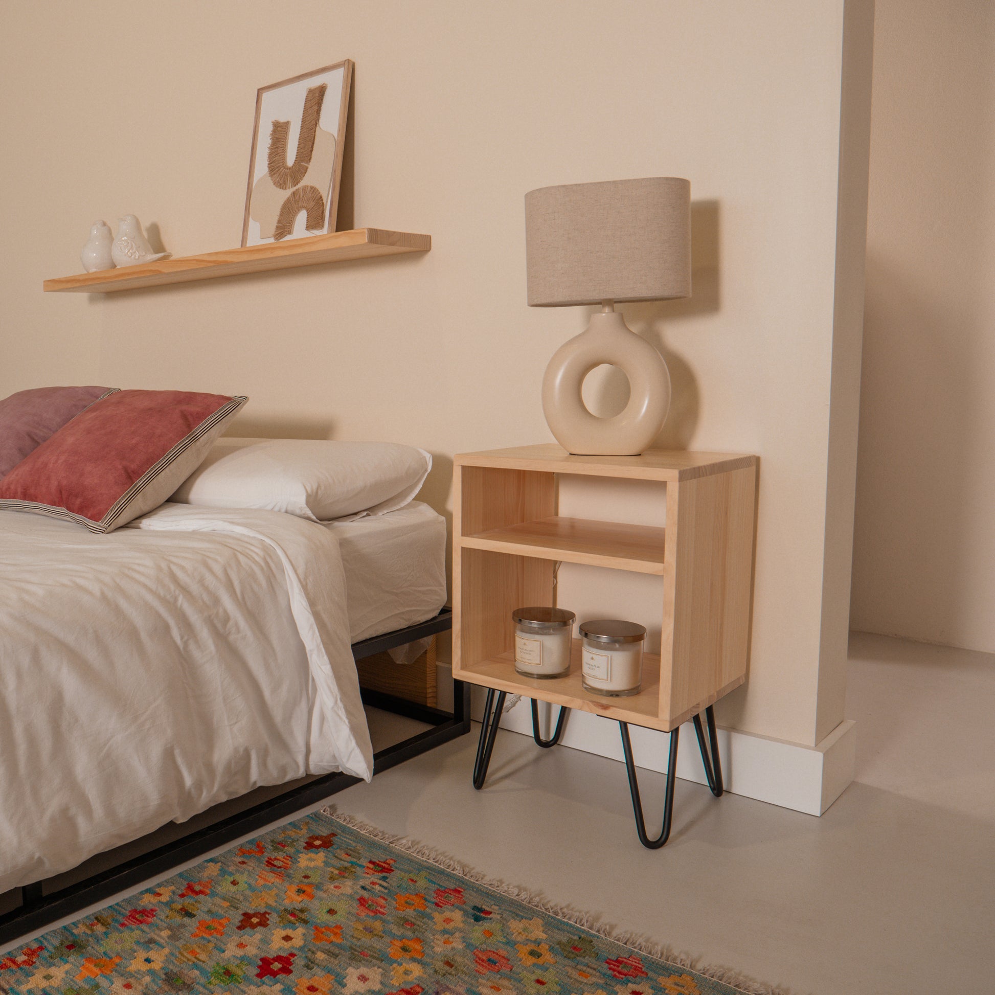 Mesita de noche HANOI. Ideal para los que no quieren sacrificar el hueco superior, con o sin cajón, para objetos personales ni el almacenaje inferior para libros o decoración.