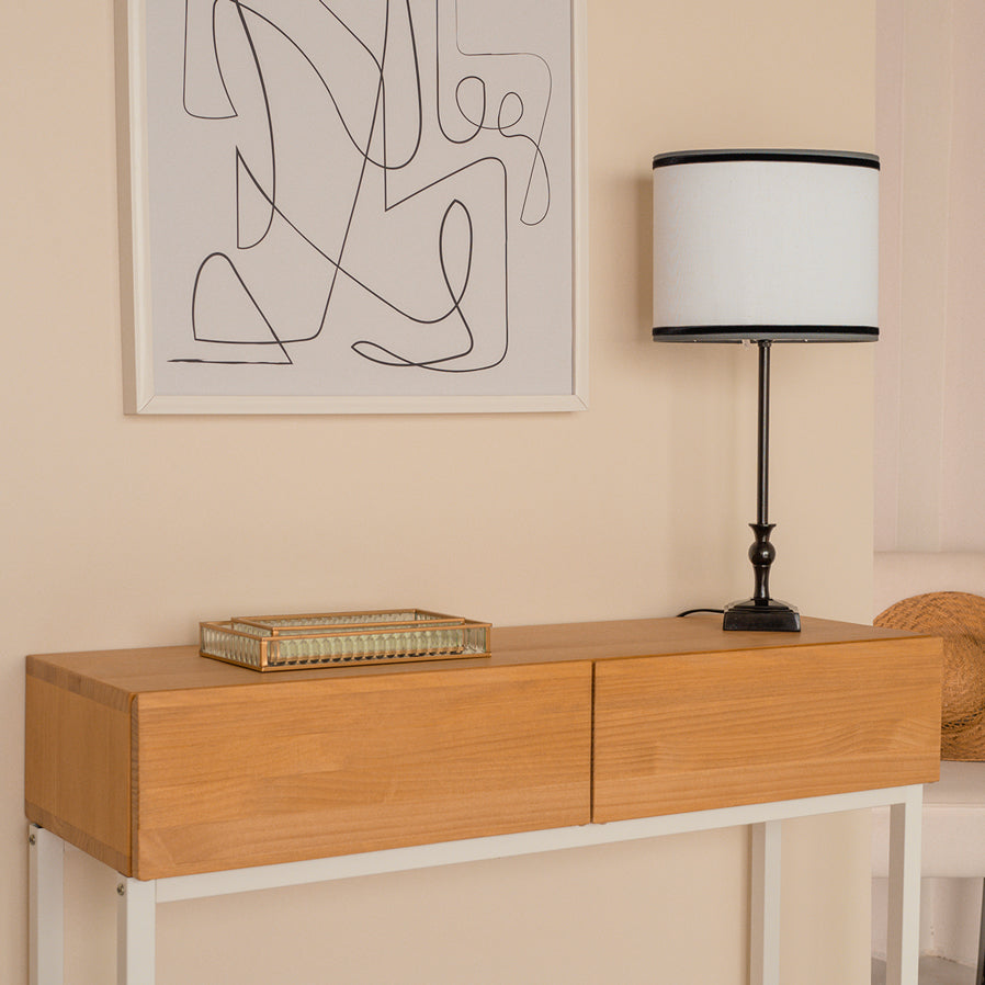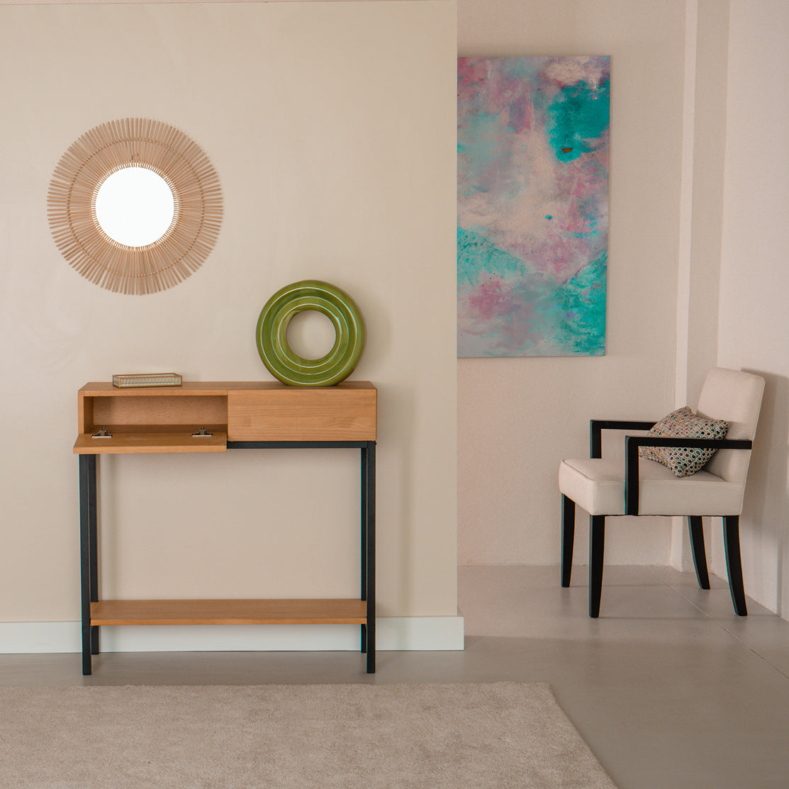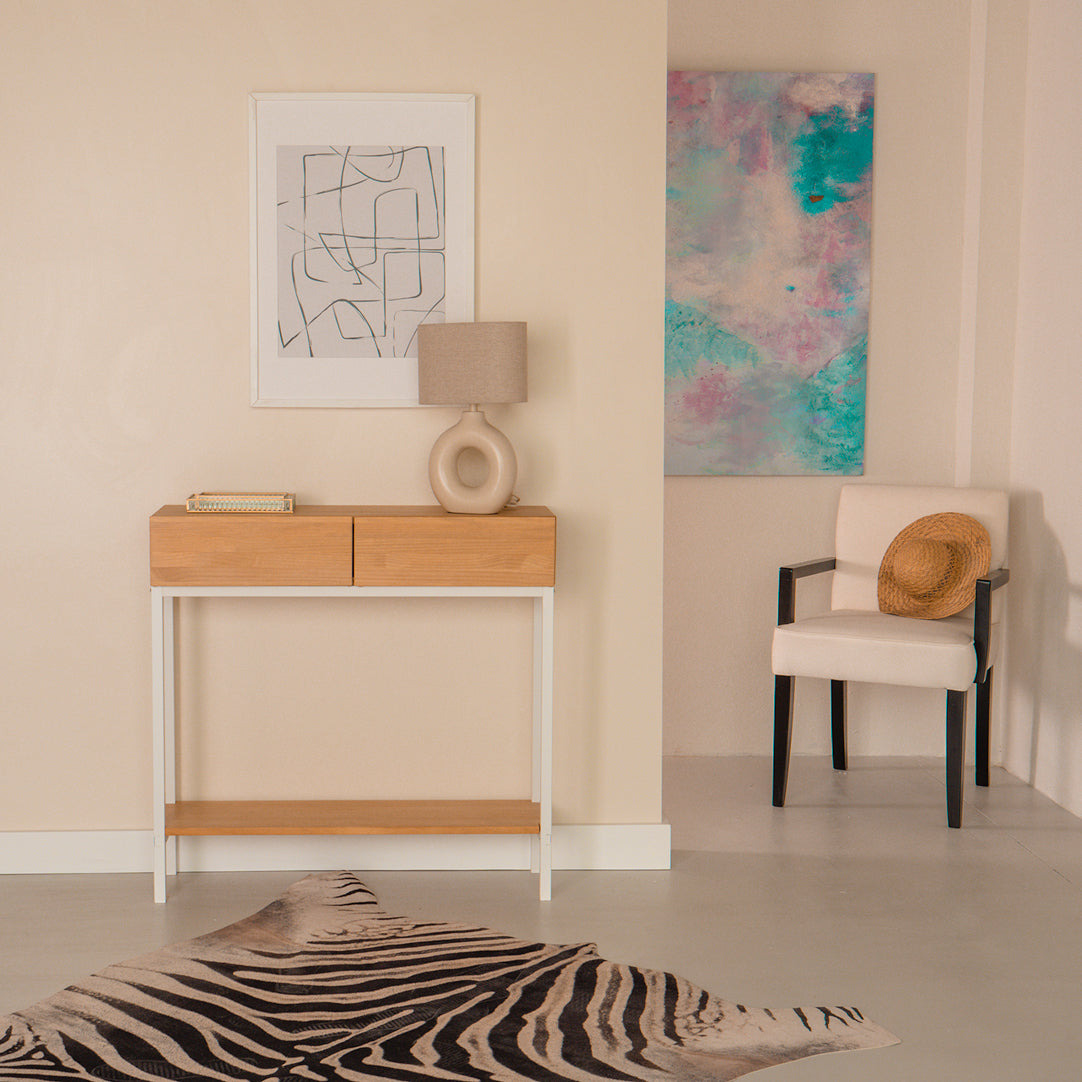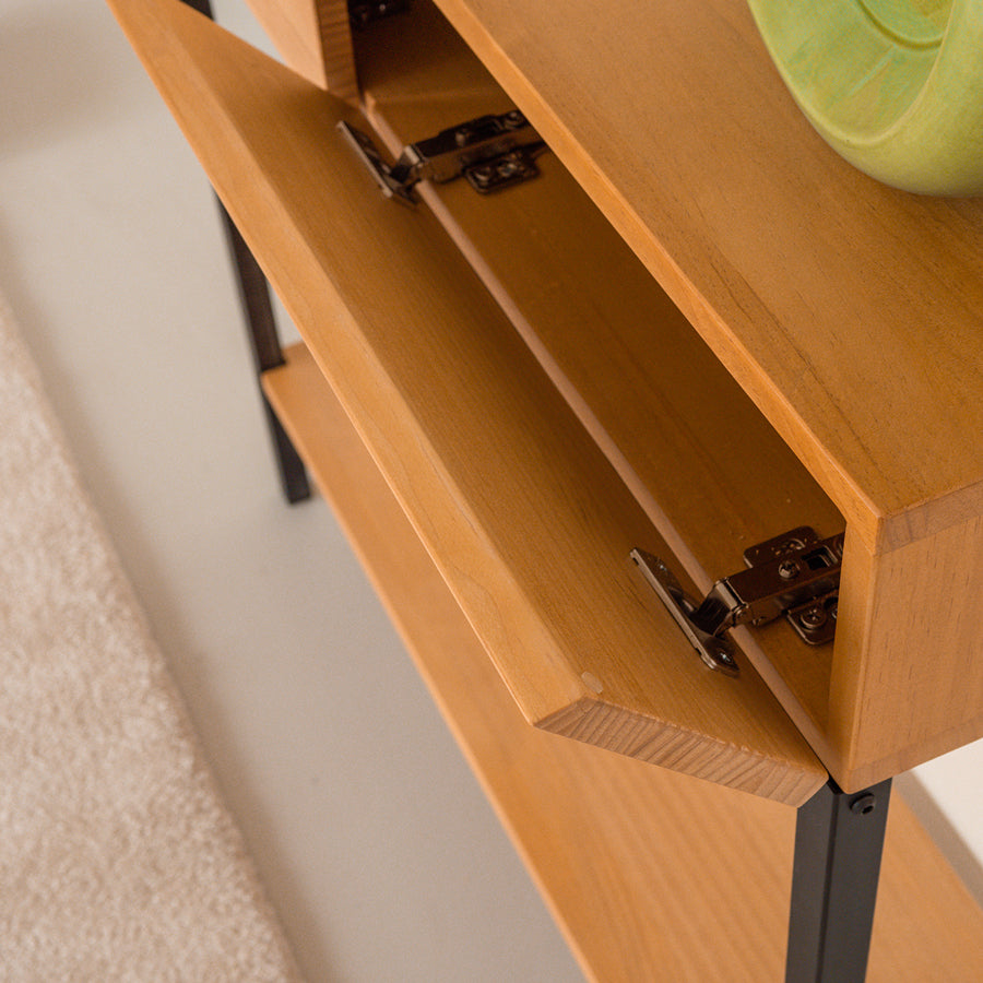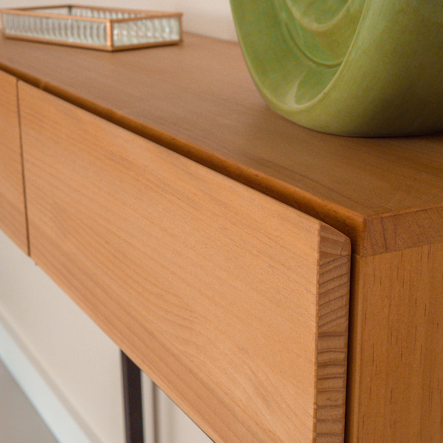 Recibidor PAI: una síntesis perfecta entre la practicidad y el diseño. El cajón está fabricado en madera maciza en su totalidad y las puertas se abren fácilmente gracias al sistema de biselado en la parte superior, prescindiendo así de tiradores.